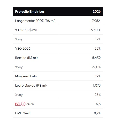 Para 2026, a expectativa apresentada na análise é de continuidade do crescimento operacional, com incremento de 10% a 15% no volume de lançamentos, o que pode levar o VGV a cerca de R$ 8 bilhões. Entre os fatores que sustentam essa projeção estão o déficit habitacional em determinadas regiões e a retomada de programas regionais de incentivo ao segmento popular. A joint venture com a Moura Dubeux também pode ampliar esse volume, dependendo do desempenho comercial e da aprovação do negócio pelo CADE.