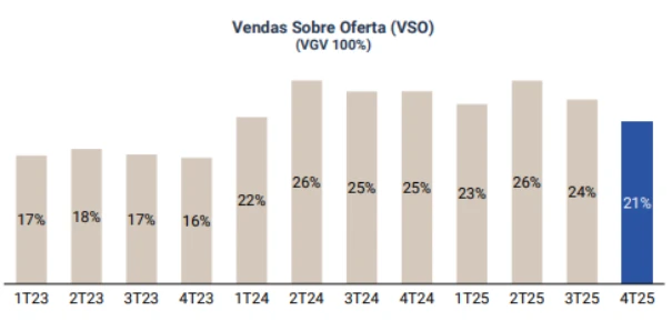 A gestão segue priorizando o indicador de Vendas sobre Oferta, com foco na geração de caixa. A estimativa é de retomada gradual do VSO ao longo de 2026, com níveis entre 24% e 26%. Em relação à rentabilidade, a análise aponta que os custos de materiais permanecem sob controle, favorecendo a manutenção de margens elevadas, enquanto a mão de obra segue como ponto de atenção no setor.